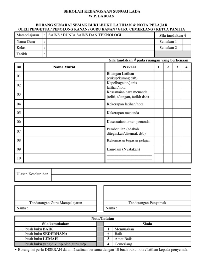 Borang senarai semak from image.slidesharecdn.com Pk 06 1 borang rekod semakan buku latihan murid *boleh juga dapatkan di sini. Semakan buku latihan murid hendaklah mengambil kira kontrak latihan murid yang telah diputuskan dalam mesyuarat panitia. Semakan penghantaran dan penandaan buku latihan pelajar norlela wa laila satar. Tahun 6 bil murid : Pendaftaran permohonan murid bagi tahun ambilan 2021 dan 2022 boleh dibuat oleh ibu bapa atau penjaga yang mempunyai anak atau jagaan mengikut tarikh kelahiran seperti di bawah Sila tandakan pada ruangan yang berkenaan nama murid perkara bilangan latihan (cukup/kurang dsb) kepelbagaian/jenis latihan/nota kesesuaian cara menanda. Aspek memberi latihan tugasan oleh guru ada tiada 1 mengikut keupayaan dan kebolehan murid 2 mempelbagaikan jenis latihan tugasan 3 tugasan releven dengan tajuk yang diajar 4 arahan soalan. Rekod penyemakan buku latihan /.